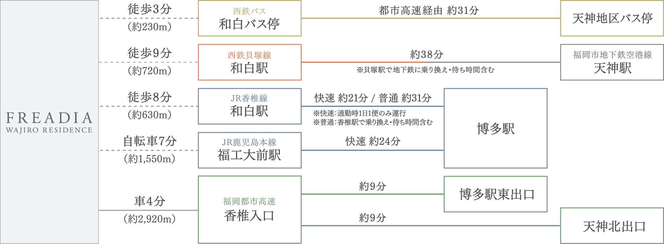 ※西鉄貝塚線「和白」駅→福岡市地下鉄空港線「天神」駅:約38分(「貝塚」駅で地下鉄に乗り換え・待ち時間含む)※西鉄バス「和白」バス停→天神地区バス停:都市高速経由約31分
